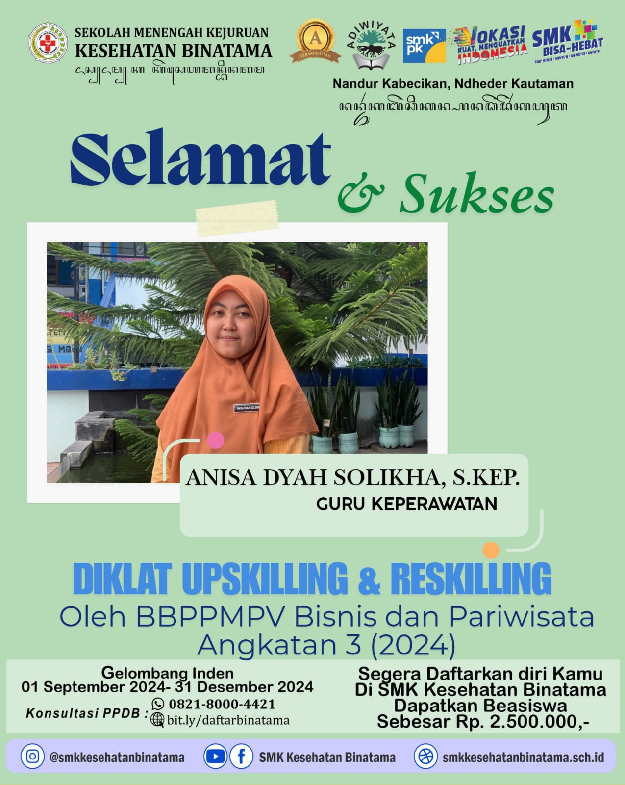 Sleman, 29 Oktober 2024 – Anisa Dyah Solikha, S.Kep., guru di SMK Kesehatan Binatama, berhasil menyelesaikan diklat upskilling dan reskiling yang diselenggarakan oleh BBPPMPV Bisnis dan Pariwisata angkatan 3 tahun 2024. Dengan mengikuti diklat ini, Ibu Anisa diharapkan dapat memberikan kontribusi yang lebih besar dalam meningkatkan kualitas pendidikan di SMK Kesehatan Binatama. Kompetensi yang baru diperolehnya akan sangat bermanfaat dalam mengembangkan kurikulum, meningkatkan metode pembelajaran, atau membimbing siswa dalam mengikuti lomba. SMK Kesehatan Binatama mengucapkan selamat atas prestasi yang telah diraih. Semoga Ibu Anisa selalu sukses dalam berkarya dan menjadi inspirasi bagi guru-guru lainnya.