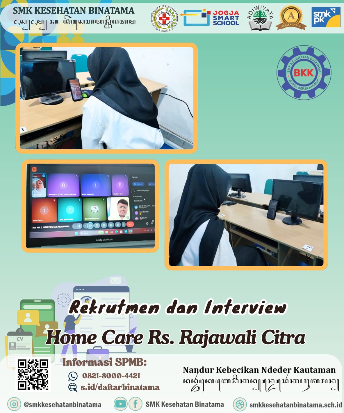 YOGYAKARTA – Menyesuaikan dengan perkembangan teknologi dan efisiensi waktu, SMK Kesehatan Binatama memfasilitasi kegiatan rekrutmen daring (online) bagi layanan Home Care RS. Rajawali Citra. Kegiatan ini memberikan pengalaman baru bagi para murid dalam menghadapi proses seleksi kerja berbasis digital.