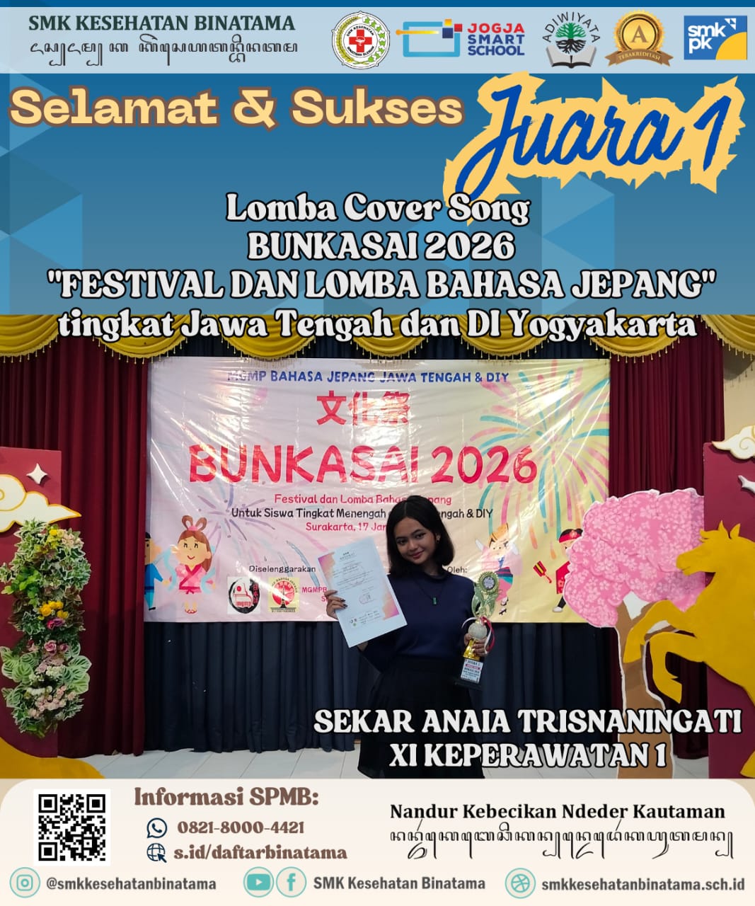 SLEMAN – Kabar prestasi membanggakan kembali datang dari SMK Kesehatan Binatama. Salah satu murid, Sekar Anaia Trisnaningati dari kelas XI Keperawatan 1, berhasil menyabet gelar Juara 1 dalam ajang Lomba Cover Song pada gelaran “BUNKASAI 2026”.