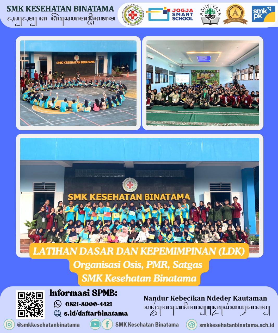Sabtu 04 Oktober 2025, SMK Kesehatan Binatama mengadakan kegiatan Latihan Dasar Kepemimpinan (LDK) Organisasi OSIS, PMR dan SATGAS, kegiatan ini dilaksanakan selama 2 hari yaitu hari sabtu dan minggu, kegiatan LDK diikuti oleh 47 peserta gabungan dari 3 organisasi yang merupakan suatu pelatihan yang bertujuan untuk meningkatkan kemampuan atau skill siswa dalam bertanggung jawab, memimpin organisasi. Salah satu tujuan latihan kepemimpinan siswa yaitu untuk membangun karakter pribadi (personality) supaya semakin terampil, berinovasi dan memahami arah organisasi.