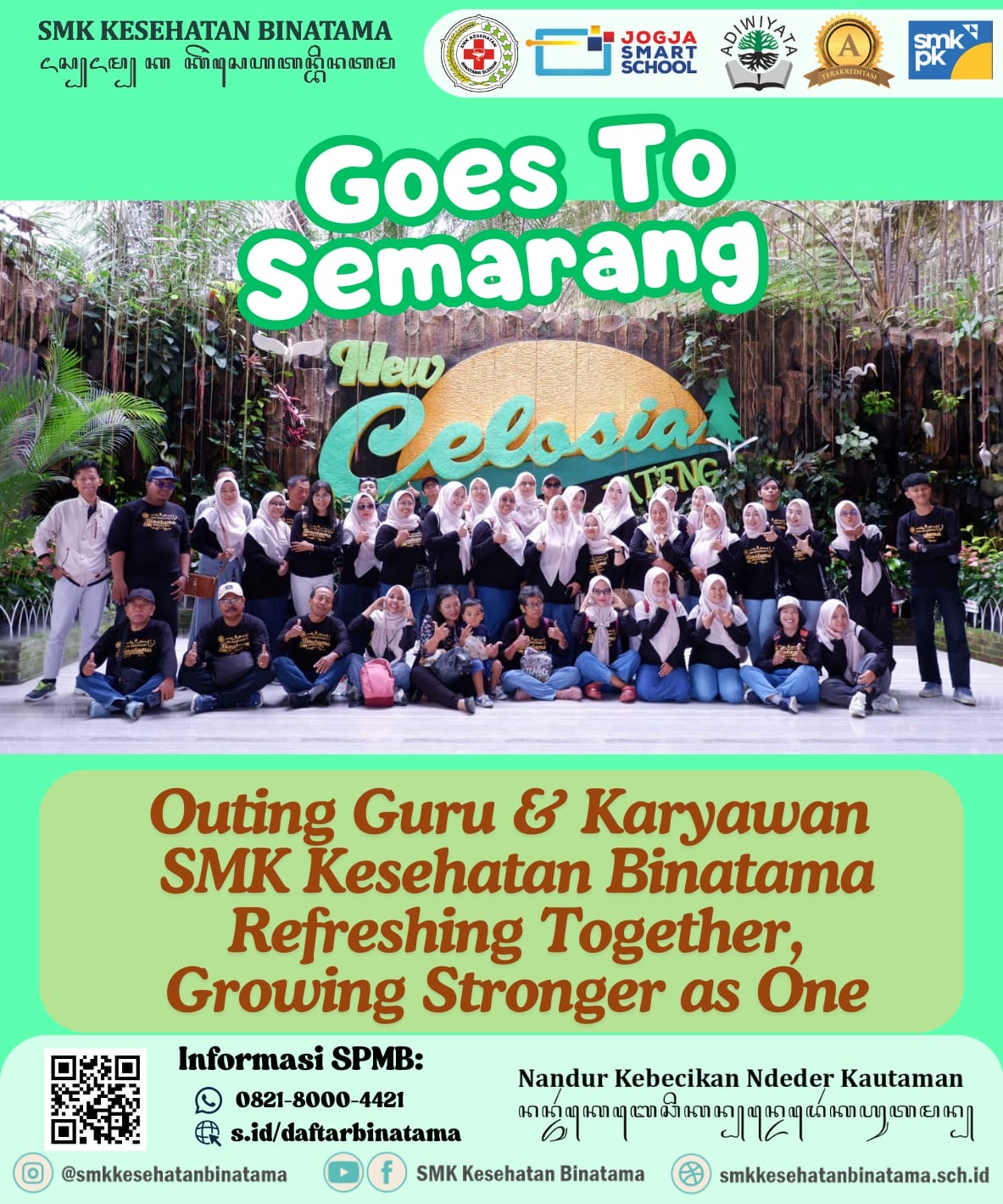 22 November 2025, SMK Kesehatan Binatama kembali mengadakan kegiatan rutin tahunan berupa Outing Guru dan Karyawan yang pada tahun ini dilaksanakan di Kota Semarang. Mengusung tema “Refreshing Together, Growing Stronger as One”, kegiatan ini dirancang untuk memperkuat hubungan antar–tenaga pendidik dan karyawan, sekaligus menyegarkan kembali semangat kerja dalam memberikan layanan pendidikan terbaik bagi para siswa.