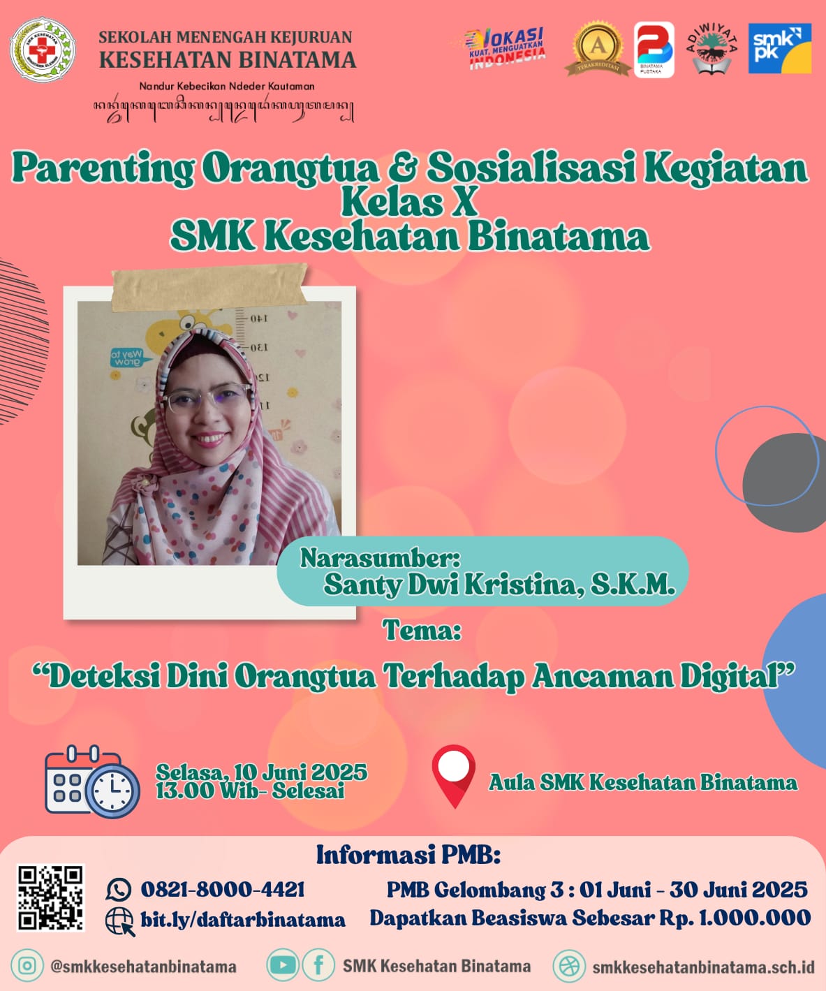 Sleman, 10 Juni 2025 – SMK Kesehatan Binatama menggelar kegiatan “Parenting Orangtua & Sosialisasi Kegiatan Kelas X” dengan tema krusial “Deteksi Dini Orangtua Terhadap Ancaman Digital”. Acara ini berlangsung di Aula SMK Kesehatan Binatama pada Selasa, 10 Juni 2025, mulai pukul 13.00 WIB.