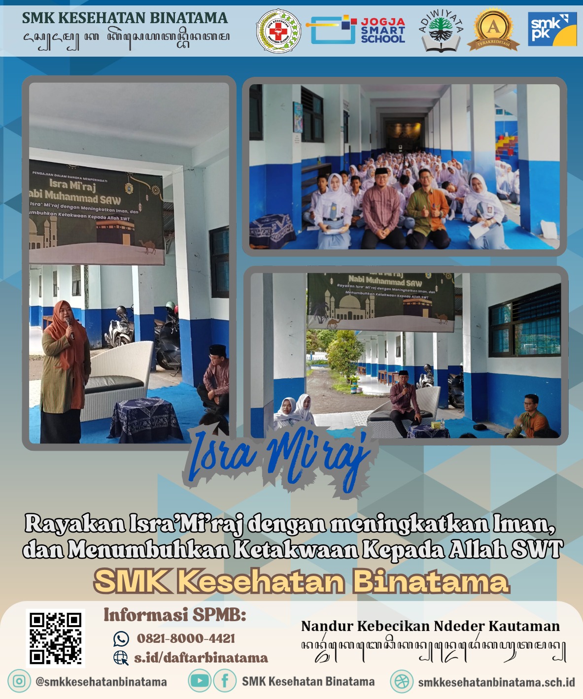 Sleman, 15 Januari 2026 – Dalam memperingati Isra Mi’raj Nabi Muhammad saw tahun 2026 ini, SMK Kesehatan Binatama mengadakan kegiatan pengajian untuk meningkatkan iman dan taqwa seluruh siswa kelas X dan XI, guru dan karyawan SMK Kesehatan Binatama.