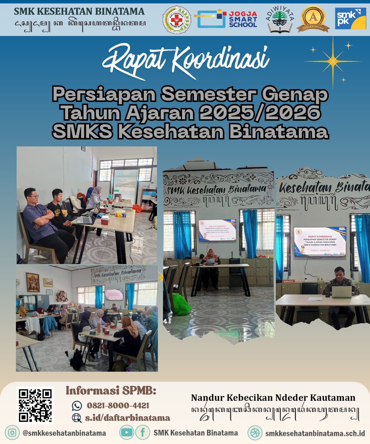 sleman, 2 Januari 2026 SMKS Kesehatan Binatama melaksanakan Rapat Koordinasi Persiapan Semester Genap Tahun Ajaran 2025/2026 sebagai langkah strategis dalam memastikan kesiapan seluruh unsur sekolah menghadapi kegiatan pembelajaran di semester genap. Kegiatan ini diikuti oleh seluruh guru dan dilaksanakan dalam suasana kondusif, komunikatif, serta penuh semangat kebersamaan.