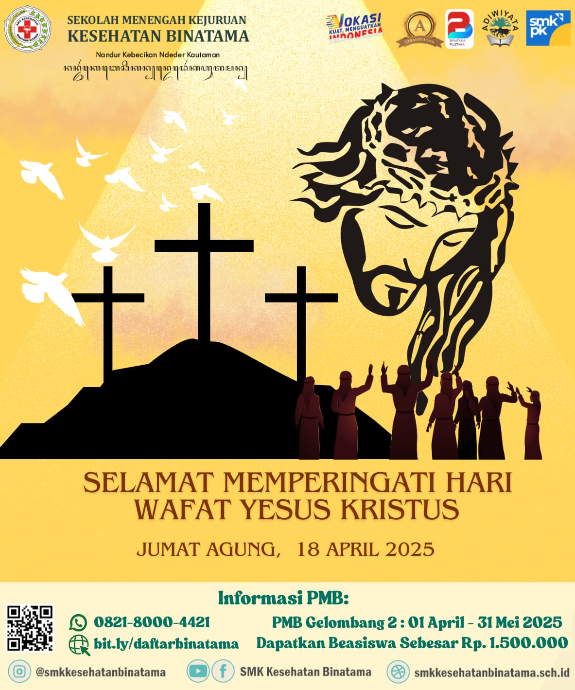 Keluarga Besar SMK Kesehatan Binatama mengucapkan selamat memperingati Hari Wafat Yesus Kristus, yang jatuh pada hari Jumat Agung, 18 April 2025.