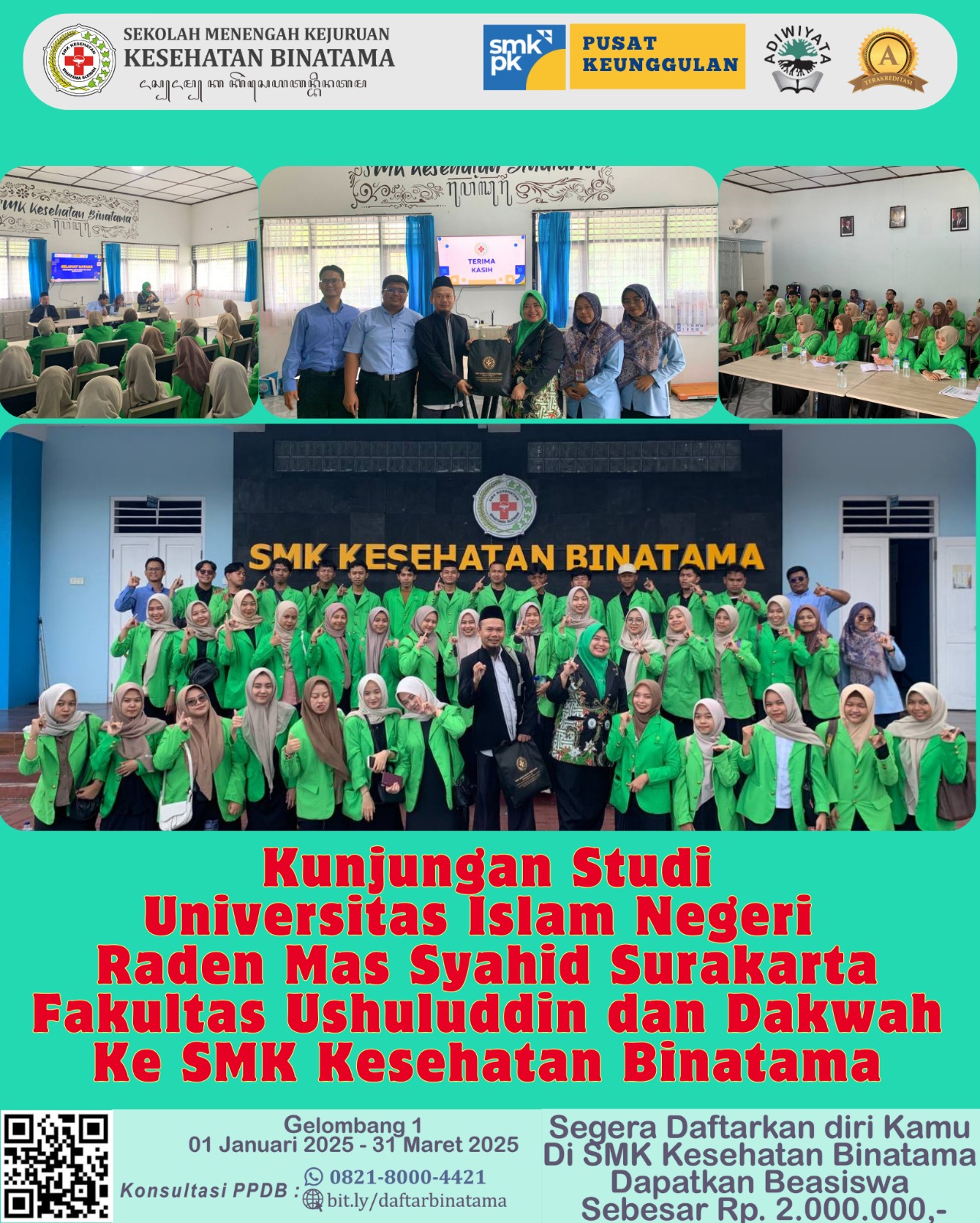 Sleman, 27 Februari 2025 – SMK Kesehatan Binatama dengan menerima kunjungan dari Fakultas Ushuluddin dan Dakwah Universitas Islam Negeri (UIN) Raden Mas Syahid Surakarta pada tanggal 18 Februari 2025. Kunjungan ini bertujuan untuk menjalin kerja sama antara kedua institusi serta berbagi pengetahuan dan pengalaman terkait pendidikan dan pengembangan karakter mahasiswa serta siswa. Kedatangan rombongan dari UIN Raden Mas Syahid Surakarta disambut hangat oleh Kepala Sekolah SMK Kesehatan Binatama, Ibu Nuri Hastuti, S.P., Gr., M.K.M., bersama dengan jajaran dewan guru dan staff pengajar.