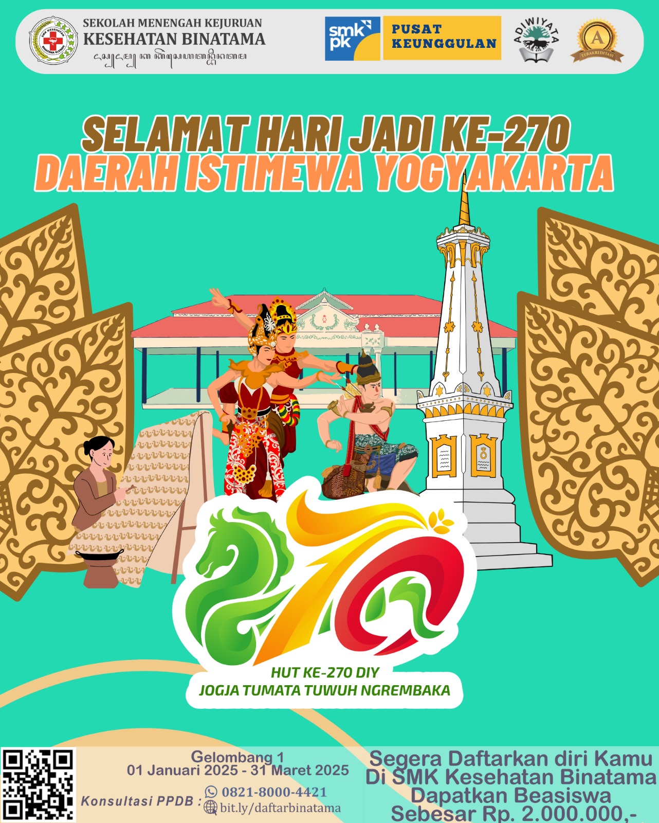 Kamis, 20 Februari 2025 – SMK Kesehatan Binatama mengucapkan selamat Hari Jadi Daerah Istimewa Yogyakarta yang ke-270. Sebagai bagian dari masyarakat Yogyakarta, kami turut merayakan perjalanan panjang dan penuh prestasi yang telah dicapai oleh daerah istimewa ini.