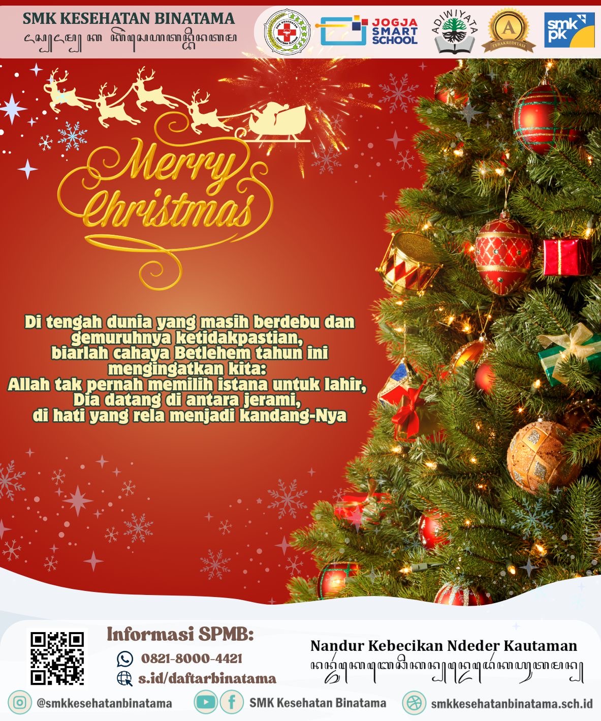 Dalam suasana penuh sukacita, SMK Kesehatan Binatama mengucapkan Selamat Hari Raya Natal kepada seluruh keluarga besar sekolah dan masyarakat yang merayakan. Natal menjadi momentum refleksi untuk memperkuat nilai kasih, kerendahan hati, serta kepedulian terhadap sesama.