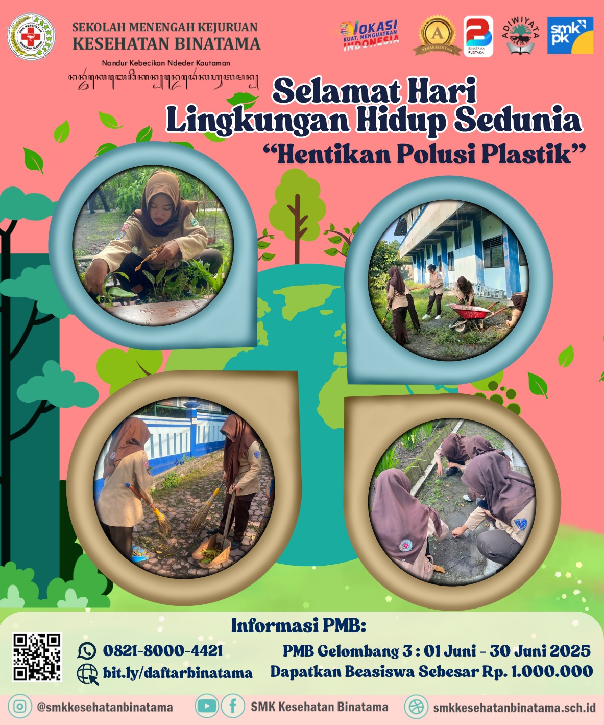 Sleman, 05 Juni 2025 – Dalam rangka memperingati Hari Lingkungan Hidup Sedunia, SMK Kesehatan Binatama menggelar berbagai kegiatan nyata dengan mengusung tema “Hentikan Polusi Plastik”. Para siswa dan guru berpartisipasi aktif dalam upaya menjaga kebersihan dan kelestarian lingkungan sekolah serta sekitarnya.