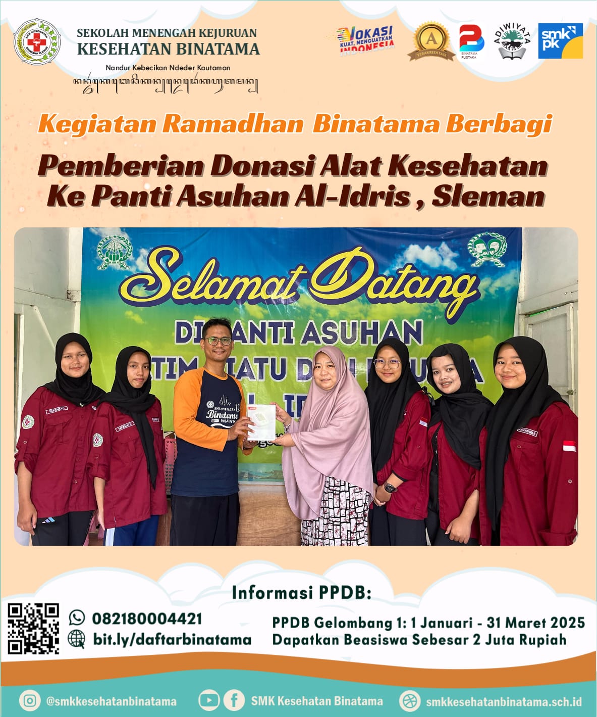Sleman, 27 Maret 2025 — Sebagai bentuk kepedulian sosial dan pengamalan nilai-nilai kemanusiaan, pada tanggal 18 Maret 2025 SMK Kesehatan Binatama menyalurkan donasi berupa alat-alat kesehatan ke Panti Asuhan Al-Idris Yogyakarta. Kegiatan ini merupakan bagian dari program rutin sekolah dalam mendukung kesehatan masyarakat, khususnya bagi anak-anak panti asuhan.