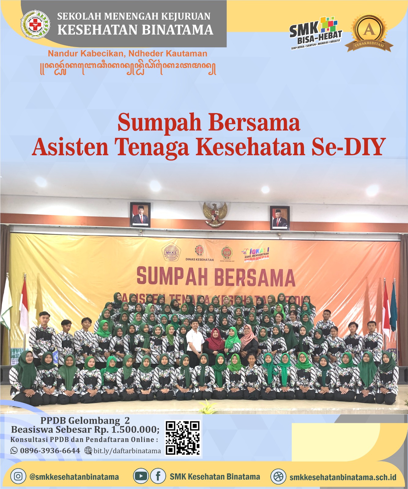 Agenda Pengambilan Sumpah Bersama Asisten Tenaga Kesehatan se-DIY tahun ini digelar di Merapi Ballroom Prima SR Hotel & Convention Center Jl. Magelang Km. 11 Yogyakarta pada Rabu, 10 Mei 2023. Acara ini diikuti oleh siswa kelas XII dari 21 SMK di wilayah Yogyakarta yang memiliki program keahlian di bidang kesehatatan yaitu Program Keahlian Keperawatan, Farmasi, dan Teknologi Laboratorium Medik. Selain siswa kelas XII acara ini juga dihadiri oleh Dinas Kesehatan DIY, Kepala Dinas Dikpora DIY, dan Ketua MKKS.
