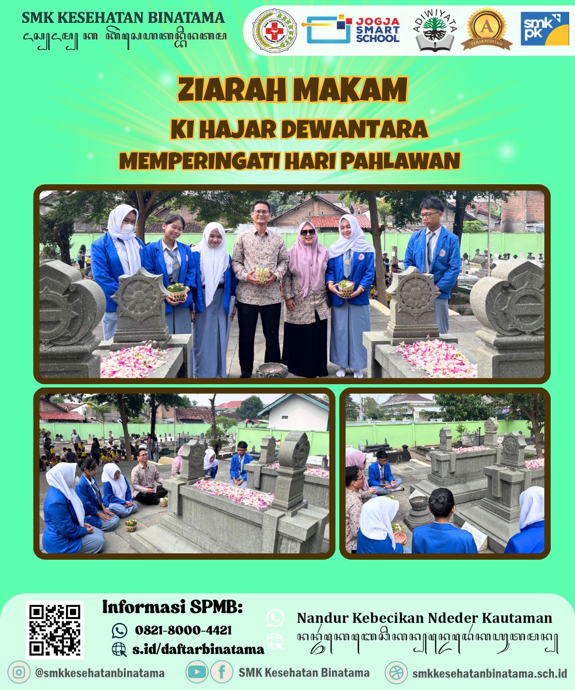 Dalam rangka memperingati Hari Pahlawan yang jatuh pada tanggal 10 November 2025, SMK Kesehatan Binatama Yogyakarta melaksanakan kegiatan ziarah makam ke Taman Makam Ki Hajar Dewantara, tokoh pendidikan nasional yang dikenal sebagai Bapak Pendidikan Indonesia.