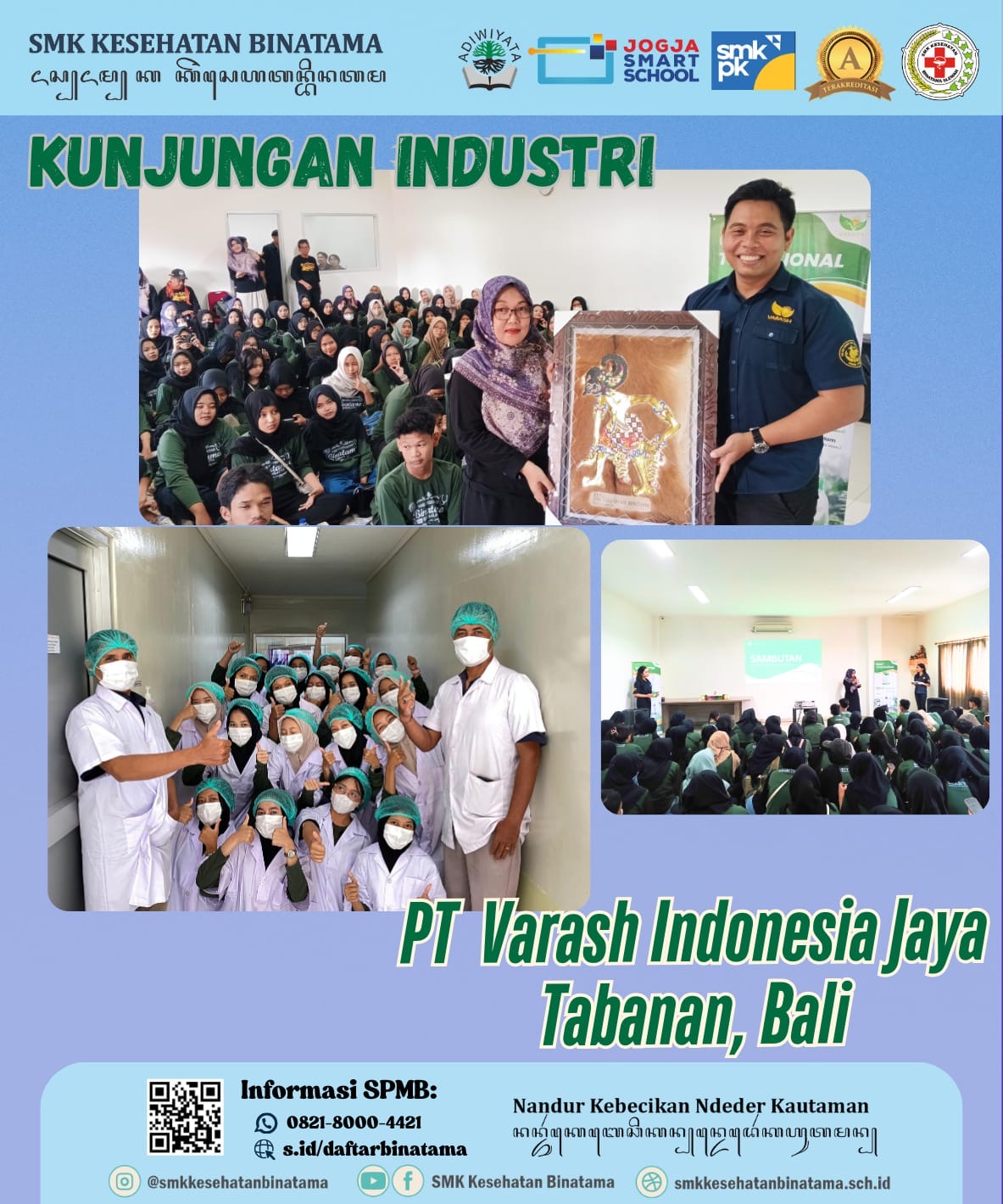 PT Varash Indonesia Jaya, Tabanan – Bali, perusahaan yang bergerak di bidang produk herbal kesehatan. Dalam kesempatan ini, SMK Kesehatan Binatama diperkenalkan pada berbagai proses penting seperti pemilihan bahan baku herbal, peracikan, hingga proses produksi yang higienis dan sesuai standar kesehatan. Mereka juga melihat langsung bagaimana sistem pengemasan serta distribusi produk dilakukan agar tetap aman sampai ke tangan konsumen.
