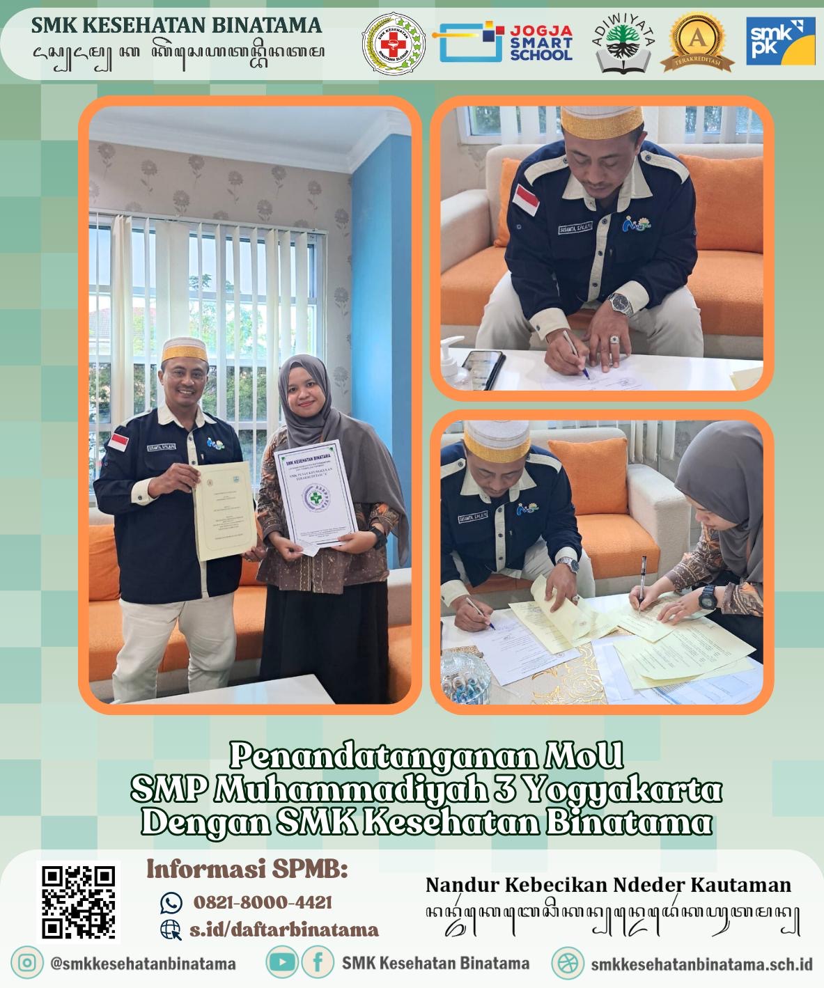 Dalam upaya memperkuat kesadaran kesehatan di lingkungan sekolah, SMP Muhammadiyah 3 Yogyakarta dan SMK Kesehatan Binatama resmi menandatangani Nota Kesepahaman (Memorandum of Understanding/MoU). Penandatanganan ini dilaksanakan bertepatan dengan program Duta Kesehatan Sekolah, sebuah inisiatif kolaboratif untuk mencetak kader muda sadar sehat.