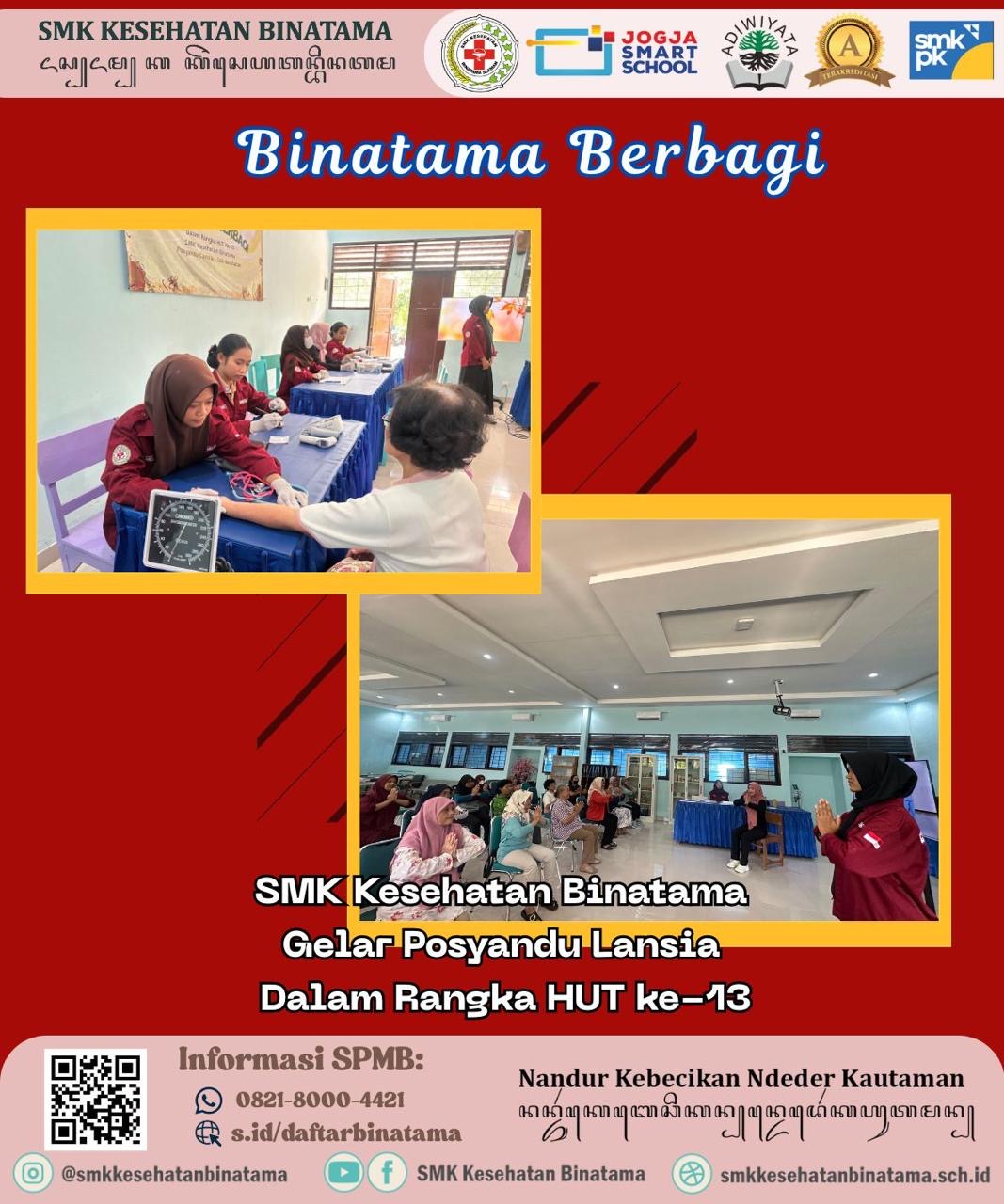 Sleman, 12 Desember 2025 – Dalam rangkaian perayaan Hari Ulang Tahun (HUT) SMK Kesehatan Binatama, sekolah hari ini menyelenggarakan kegiatan Posyandu Lansia. Kegiatan ini dilaksanakan di ruang Teaching Factory (Tefa) sekolah dan merupakan wujud nyata dari komitmen SMK Kesehatan Binatama dalam program Pengabdian Masyarakat di bidang kesehatan.